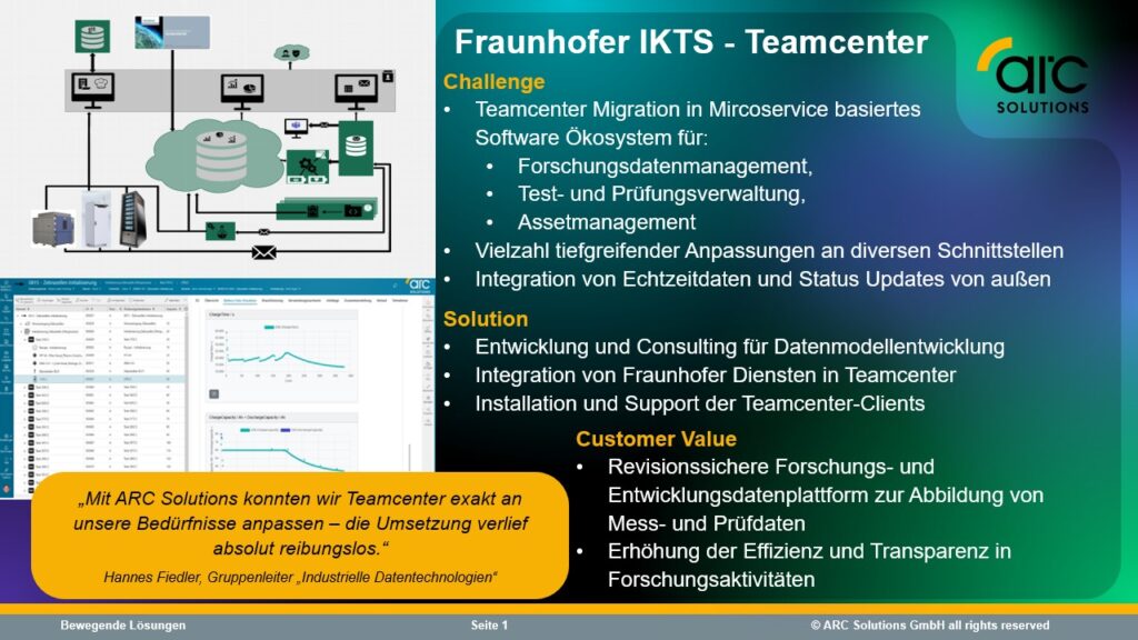 Teamcenter bildet am Fraunhofer IKTS BITC (Batterie-Innovations- und Technologie-Center) die digitale Plattform für Forschungsdaten, Testprozesse und das Assetmanagement. Es integriert Mess- und Prüftechnik wie Multifunktionscycler und Klimakammern und macht umfangreiche Zeitreihen transparent nutzbar.